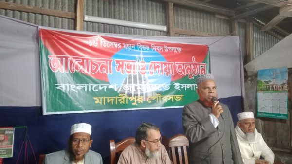 স্টাফ রিপোর্টার:১৬ই ডিসেম্বর মহান বিজয় দিবস উপলক্ষে বাংলাদেশ জামায়েত ইসলামী মাদারীপুর পৌরসভার উদ্যোগে আলোচনা ও দোয়া অনুষ্ঠান আজ সকাল সাতটায় স্থানীয় কার্যালয়ে অনুষ্ঠিত হয়। উক্ত অনুষ্ঠানে সভাপতিত্ব করেন মাদারীপুর পৌরসভা